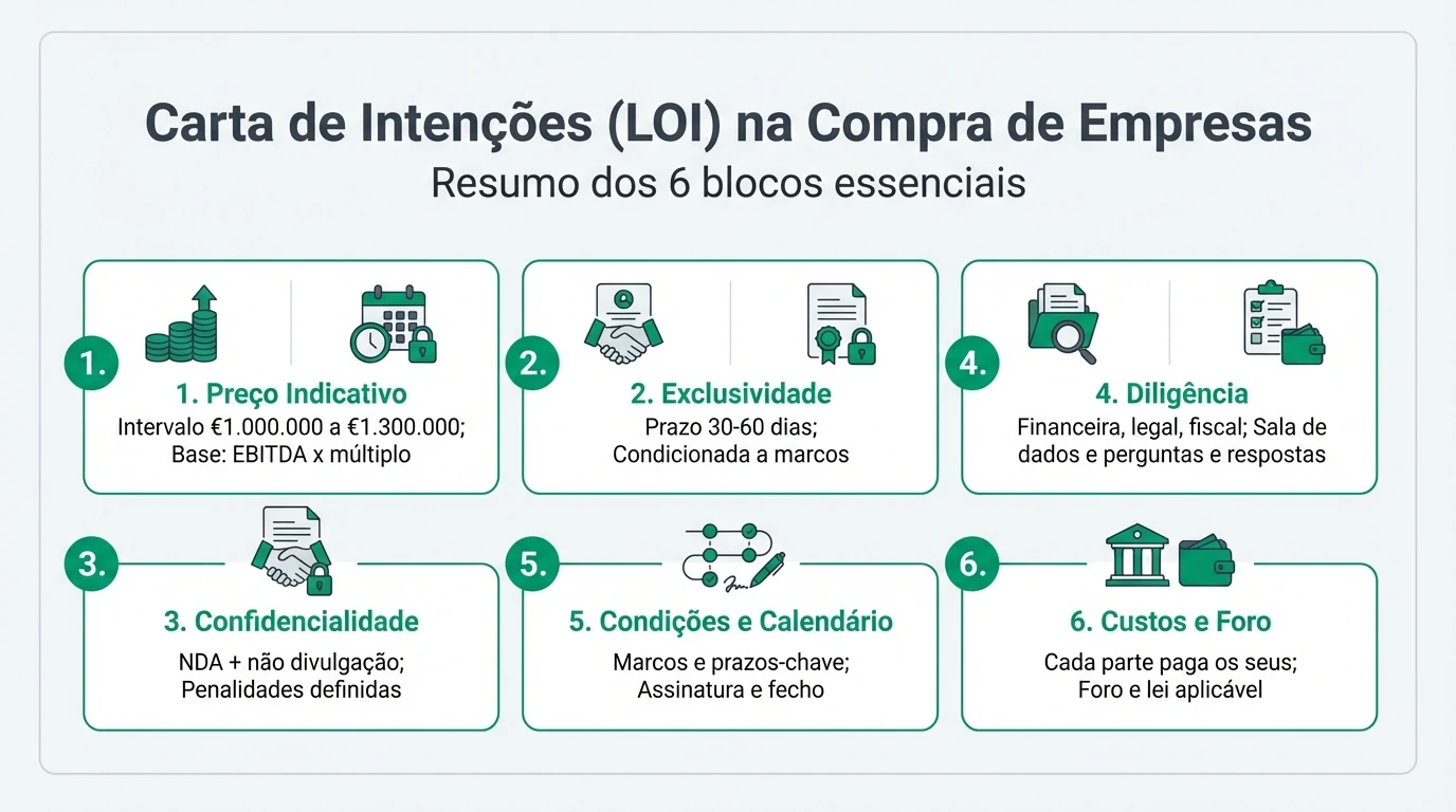 Guia completo sobre carta de intenções (LOI) em M&A em Portugal: estrutura, cláusulas vinculativas, exclusividade, preço, prazos e riscos. Inclui exemplos práticos, tabelas e checklist.