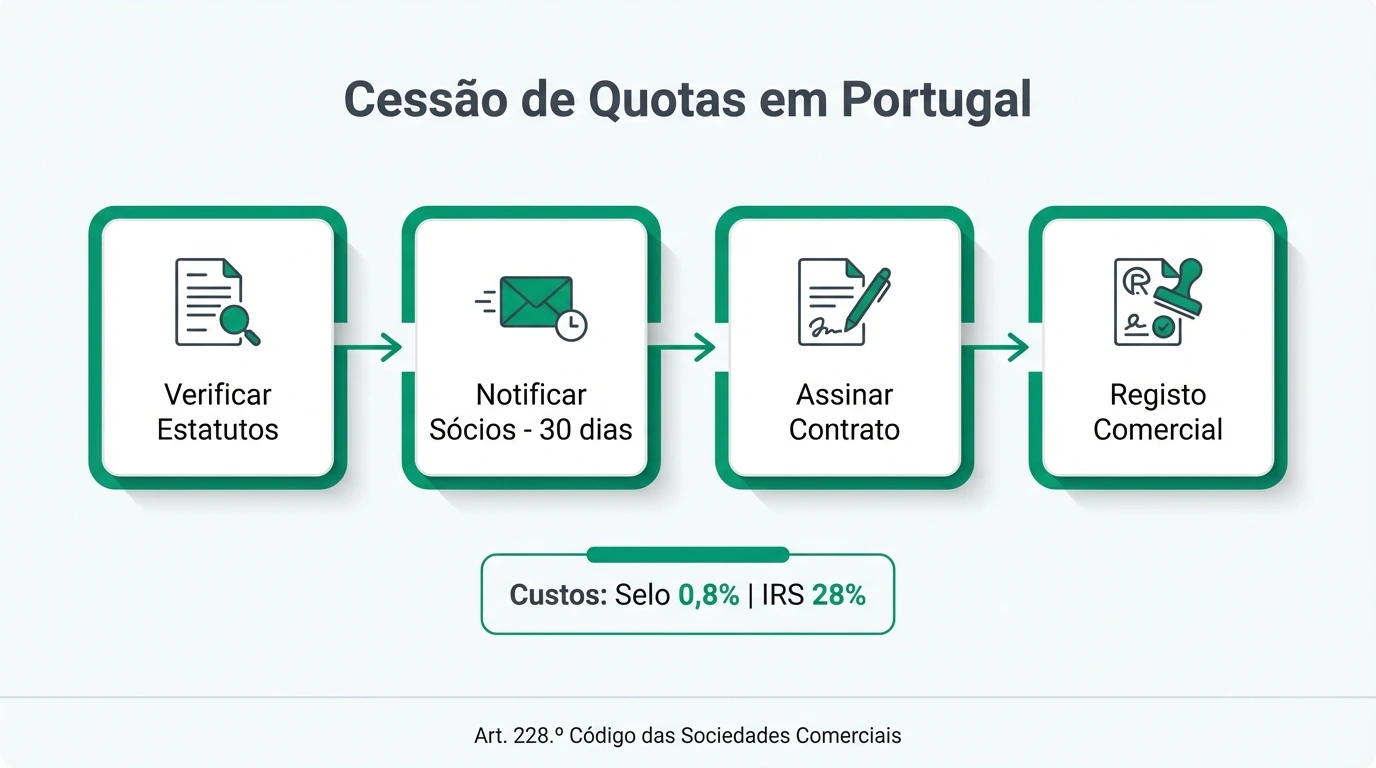 A cessão de quotas é a transferência da participação social de um sócio para outra pessoa, regulada pelo artigo 228.º do Código das Sociedades Comerciais. Requer documento escrito com assinaturas reconhecidas (não exige escritura pública). Custos típicos: Imposto de Selo 0,8% + mais-valias IRS até 28% + registo comercial ~€200. Os outros sócios têm direito de preferência de 30 dias.