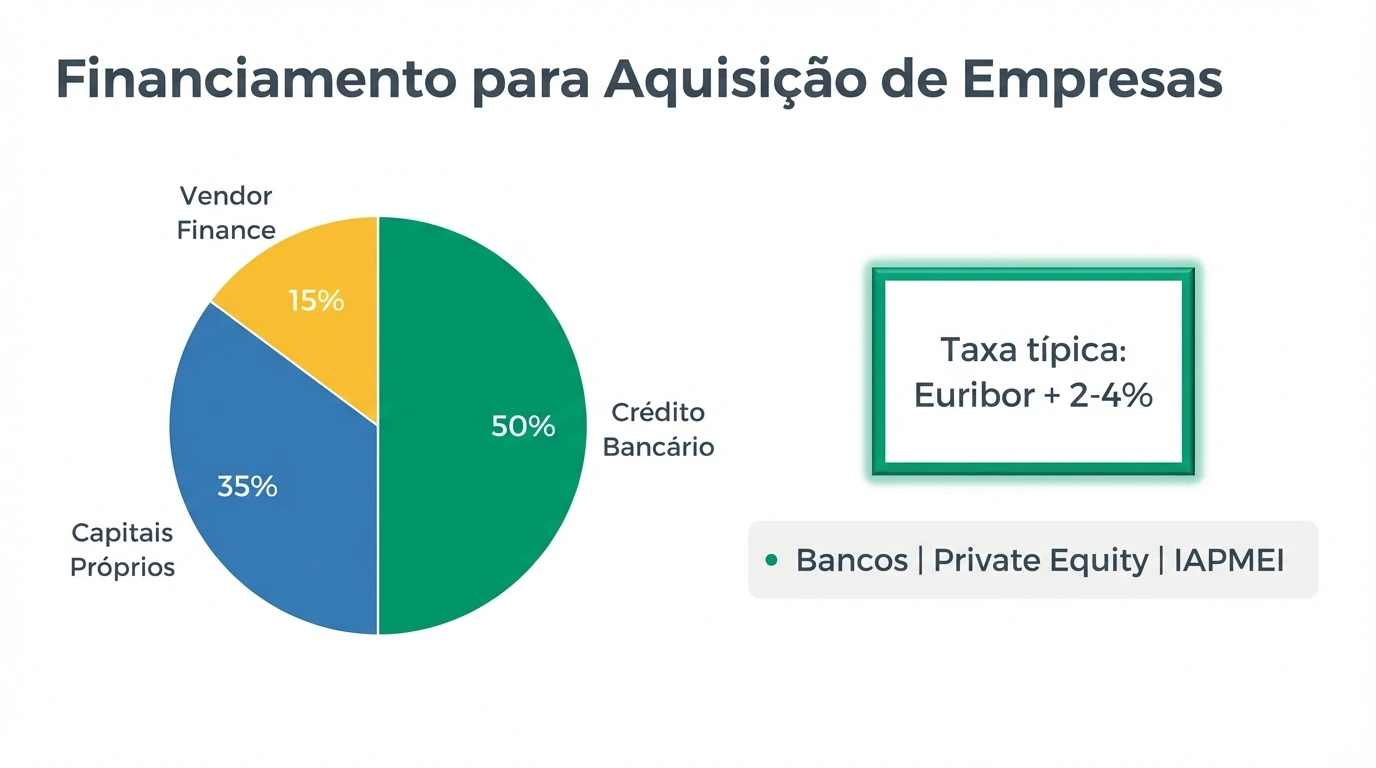 Todas as opções de financiamento para aquisição de empresas em Portugal. Crédito bancário, LBO, vendor finance, private equity, incentivos públicos e como estruturar.